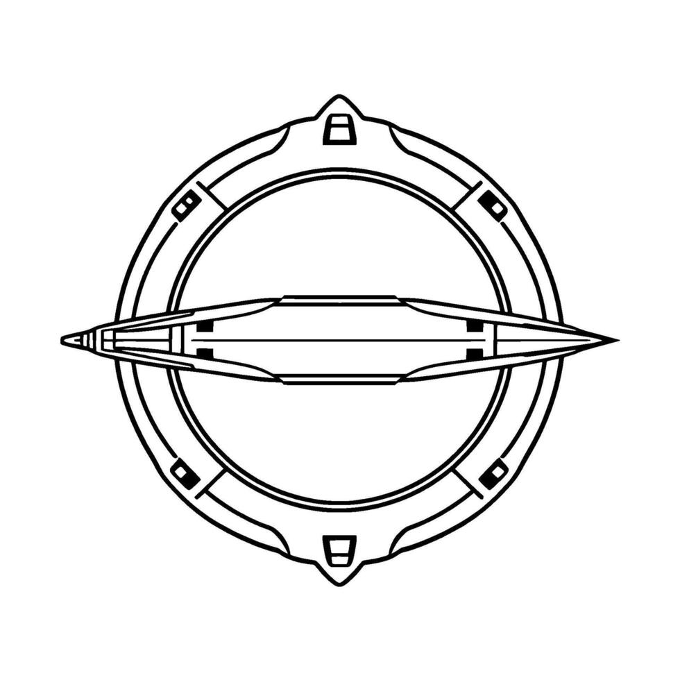 Geometric Illustration of a futuristic spaceship emblem with stylized , contained within a circular structure with squared accents. Free Vector