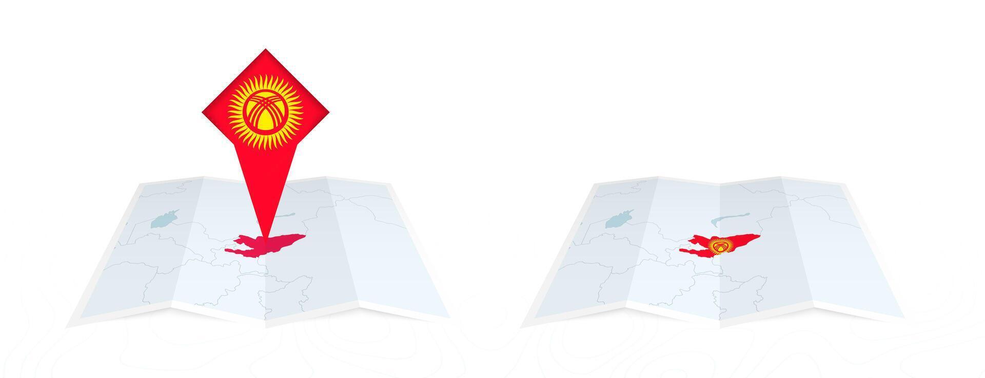 Two versions of an Kyrgyzstan folded map, one with a pinned country flag and one with a flag in the map contour. Template for both print and online design. Pro Vector