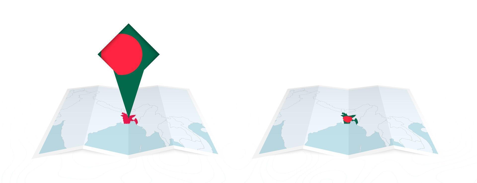 Two versions of an Bangladesh folded map, one with a pinned country flag and one with a flag in the map contour. Template for both print and online design. Pro Vector