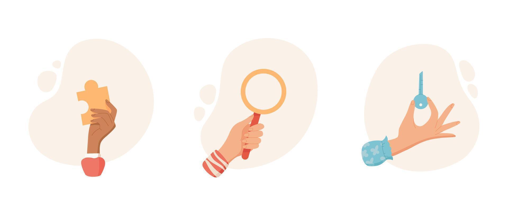 Hand gesture hold key, puzzle piece, and magnifying glass. Symbol of search and teamwork in flat illustration. Ideal for educational or problem themes in isolated graphic set. Pro Vector