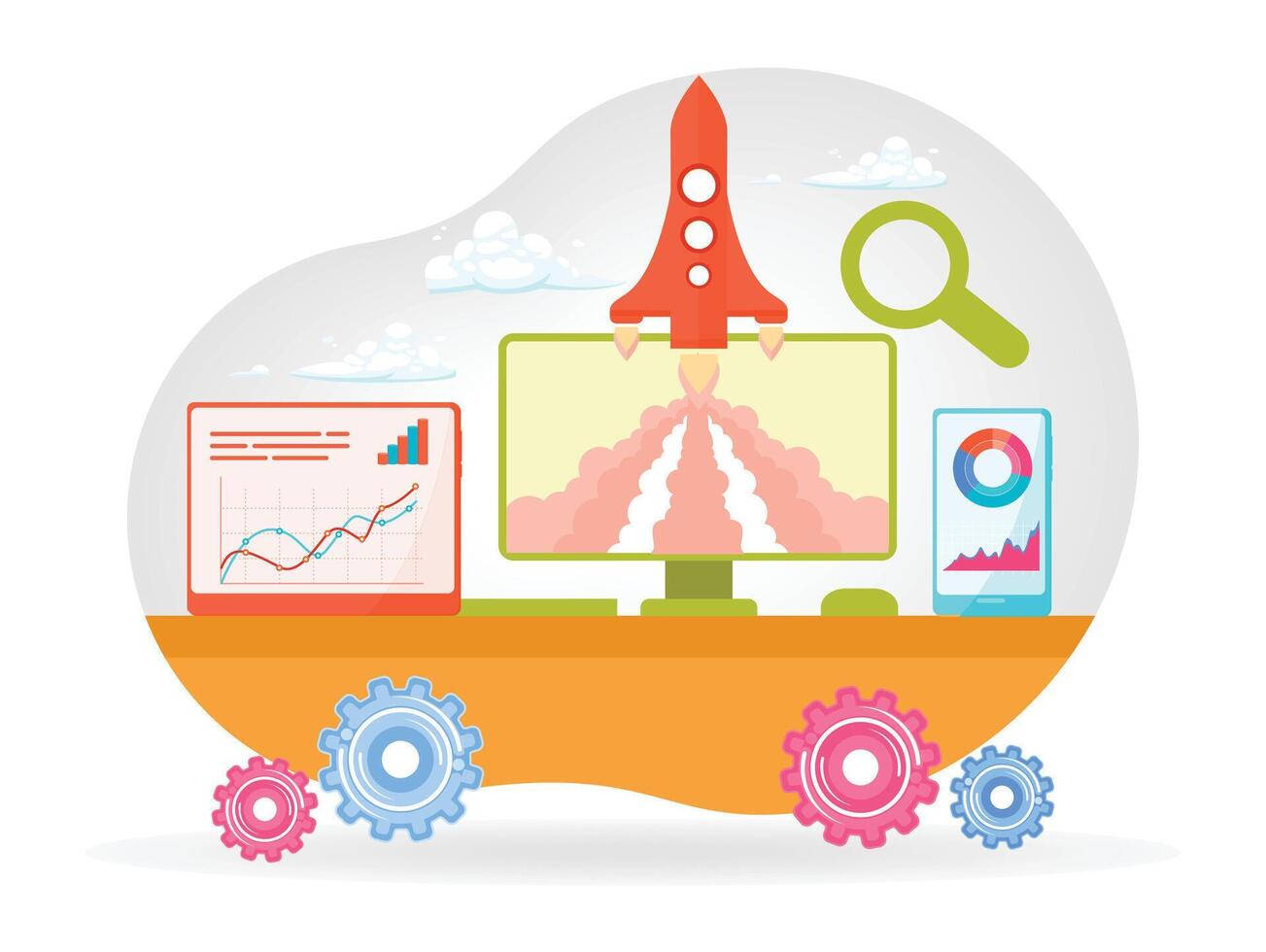 Device Data Business Analysis Concept. Showing Graphs, Growth, and Innovation Launch. Pro Vector