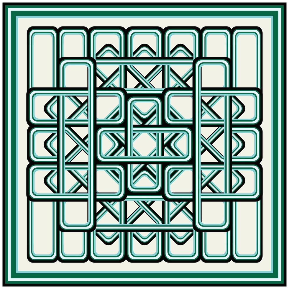 Geometric abstract design featuring overlapping teal and black lines, creating a complex pattern within a square border. Pro Vector