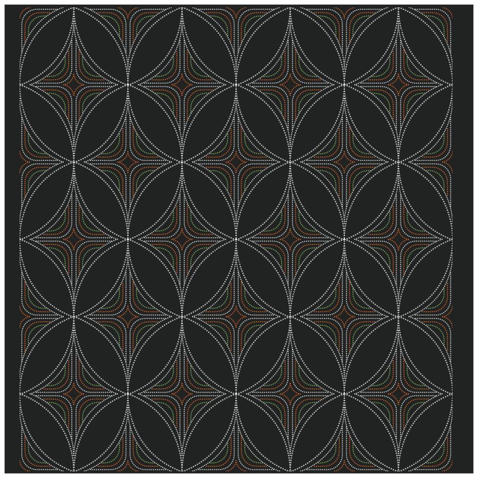 A geometric pattern featuring interconnected white, green, and orange dotted arches on a black background, creating a visually striking design. Pro Vector