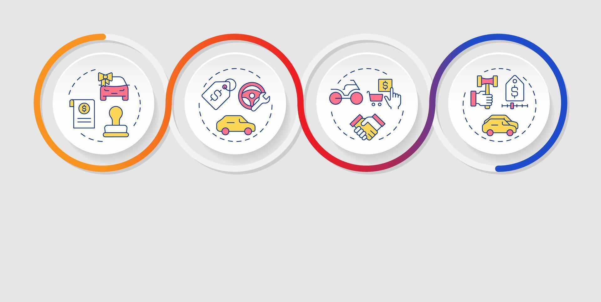 Auto dealership infographics circles sequence. Selling process. Agreement, deal. Visualization layout with 4 steps. Info chart loop process presentation Pro Vector
