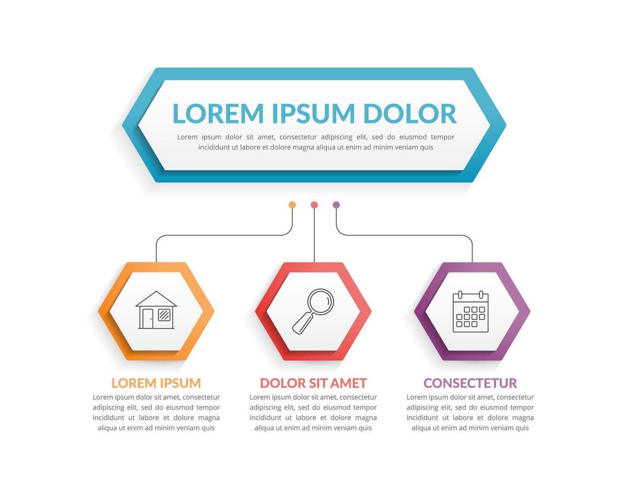 Infographic template with hexagons with main idea and 3 steps or options, workflow, process chart Pro Vector