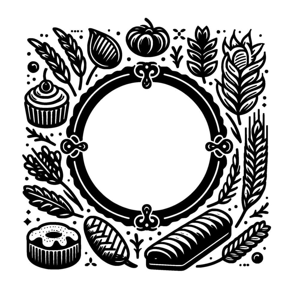 Black and white square frame bakery harvest elements surrounding circular empty space, minimalist design. Pro Vector