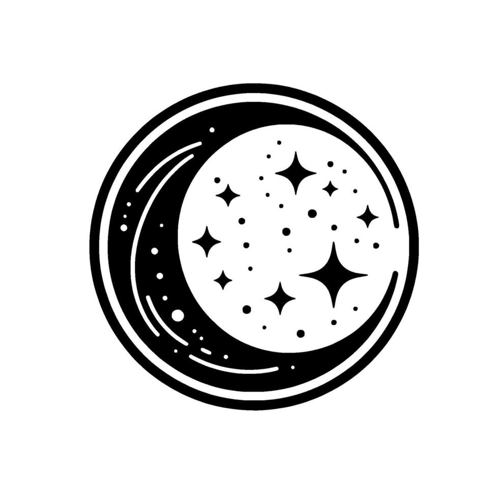 Black and white celestial graphic a crescent moon and stars within a circular frame, minimalist design. vector