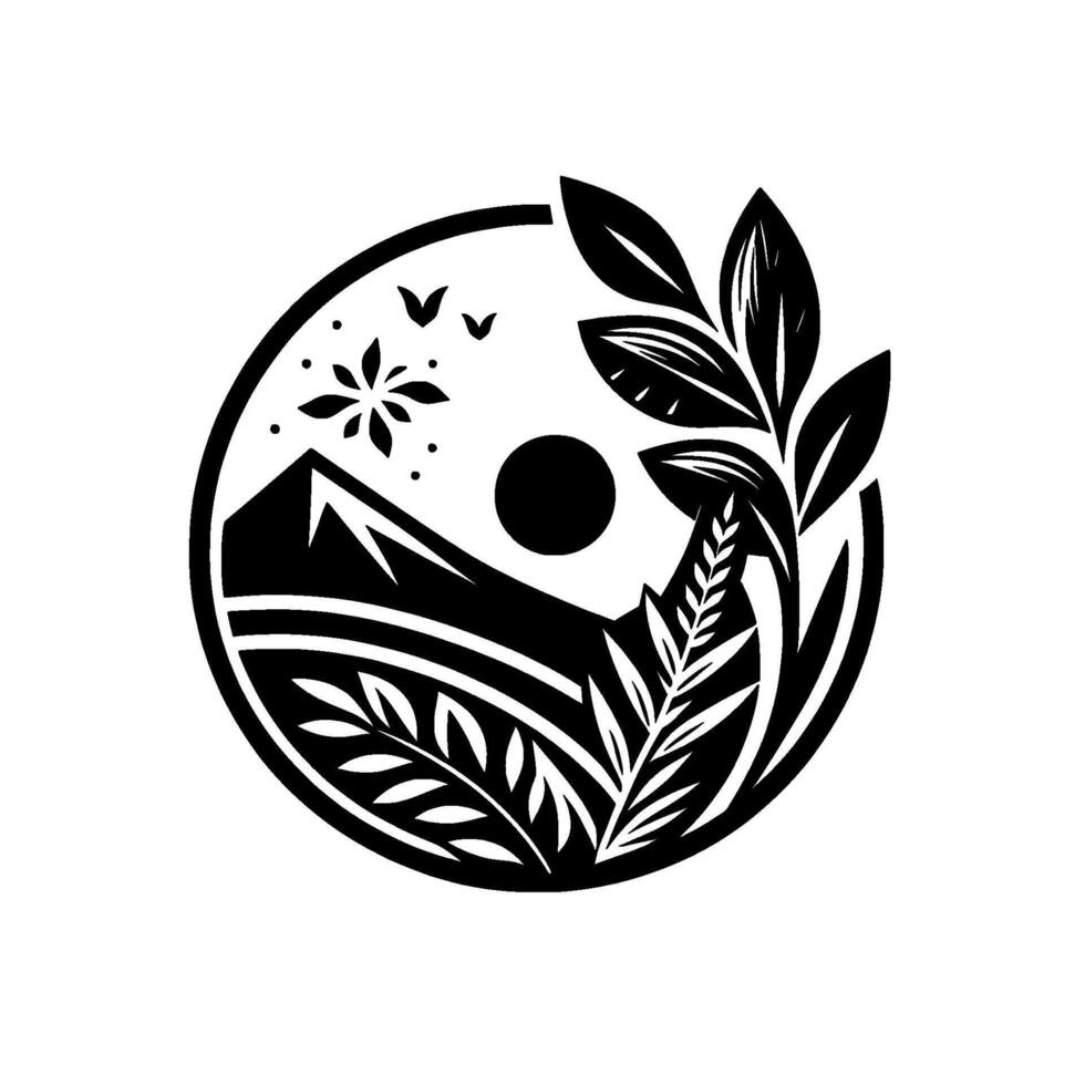 Monochrome circular nature scene mountain, flora, sun, birds, and geometric patterns, representing tranquility and balance within a minimalist aesthetic. vector