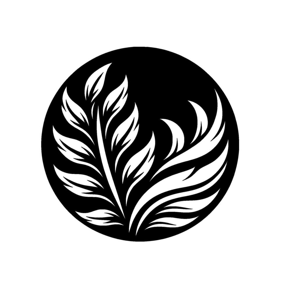 Bold, symmetrical botanical design white leaves and flowing forms contained within a black circular backdrop against a stark white background. vector