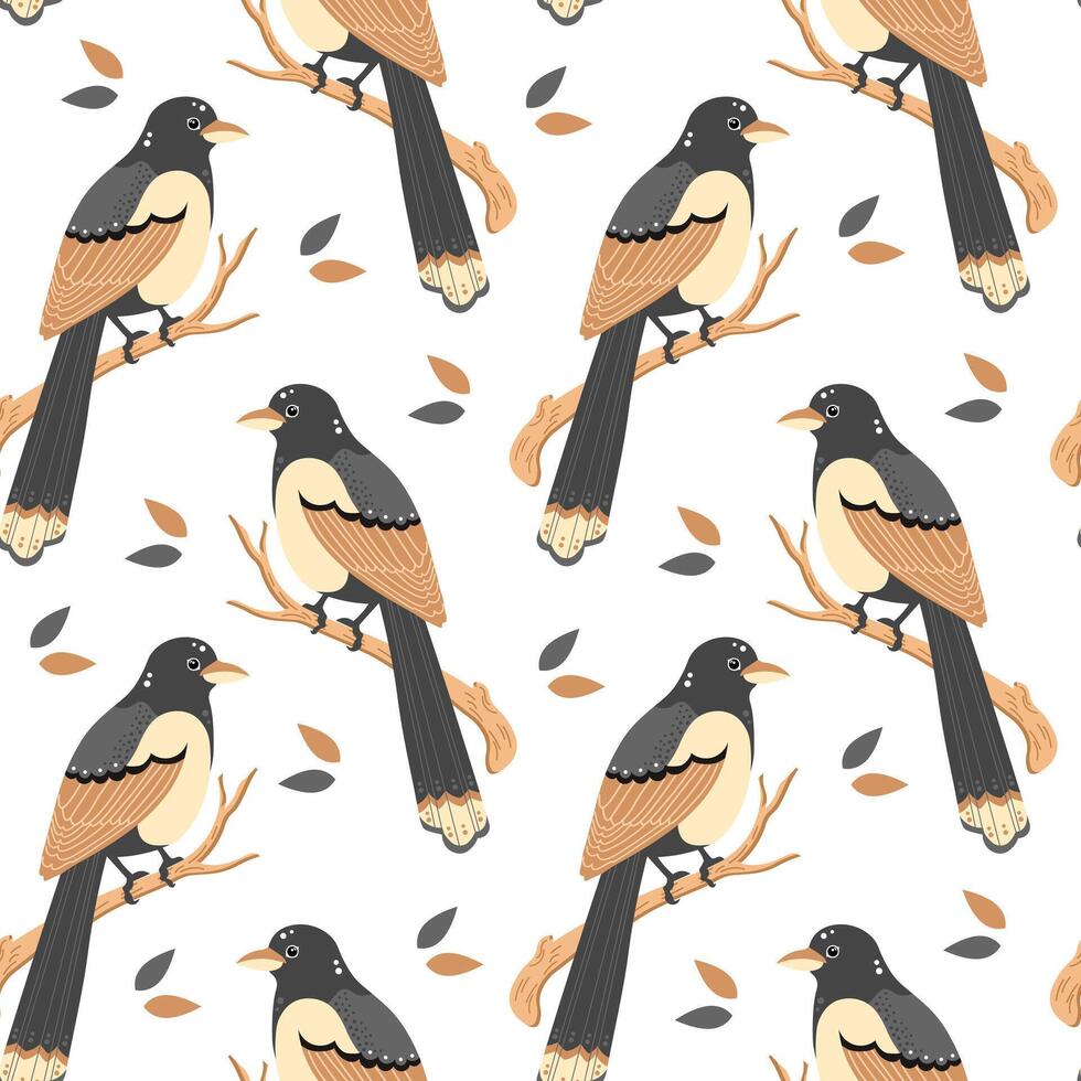 Seamless pattern, cute magpie birds on a branch on a white background. Print, textile Pro Vector