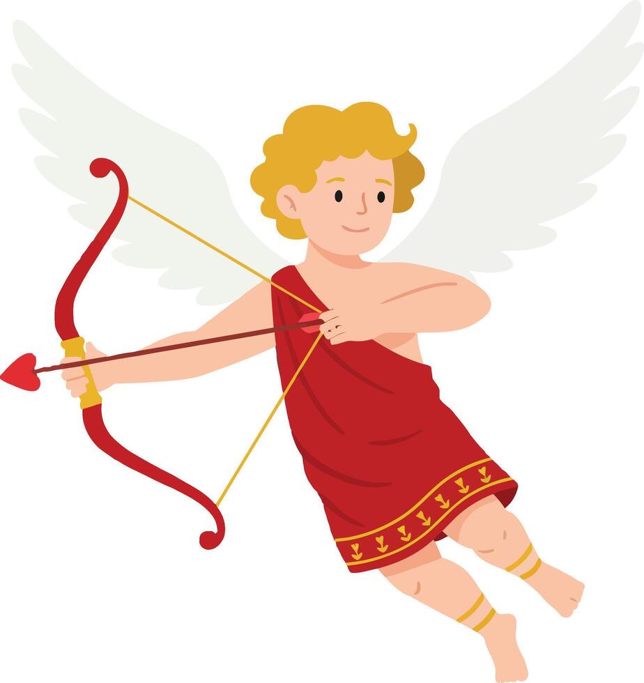 A cherubic angel in a flowing red robe wielding a bow and arrow, depicted in a playful flat design style, creating charming art Pro Vector