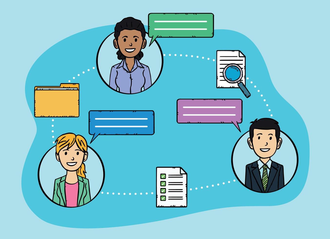 Hand-drawn graphic of employees chatting online and sending files, checklists and folders with data. The characters have speech bubbles next to them. Doodle style graphic. Pro Vector