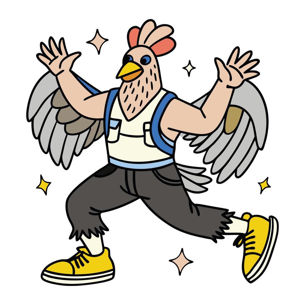 A Funny Chicken Character with Wings and a Backpack Running. Pro Vector