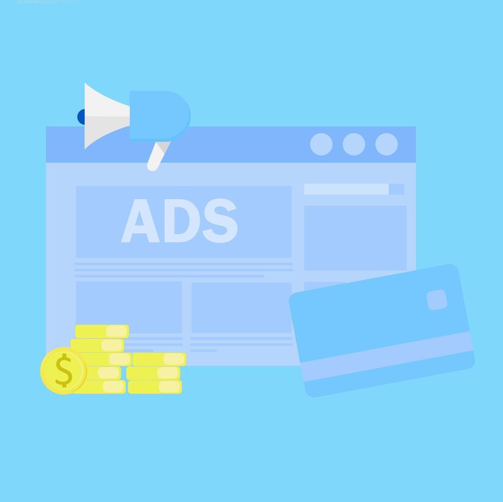 Ad Revenue - increase and optimize online pay per click advertising revenue. Illustration of a browser with website banner ads generating cash revenue Pro Vector