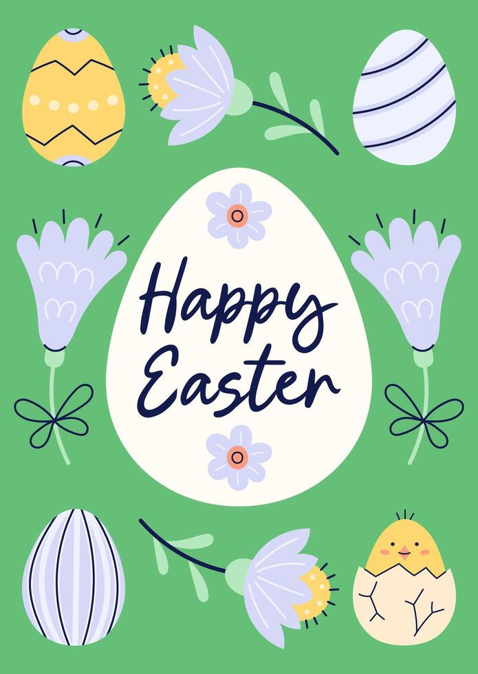 Happy Easter simple card with eggs and flowers. Design with text on green background. Happy Easter hand drawn card. Flat illustration with partial outline. illustration. Pro Vector