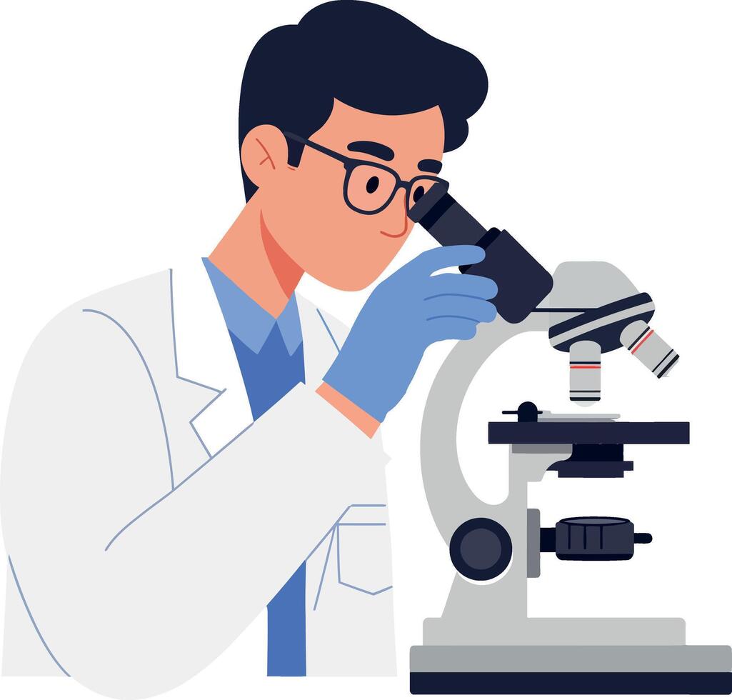 Scientist observing samples through a microscope in a flat illustration Pro Vector