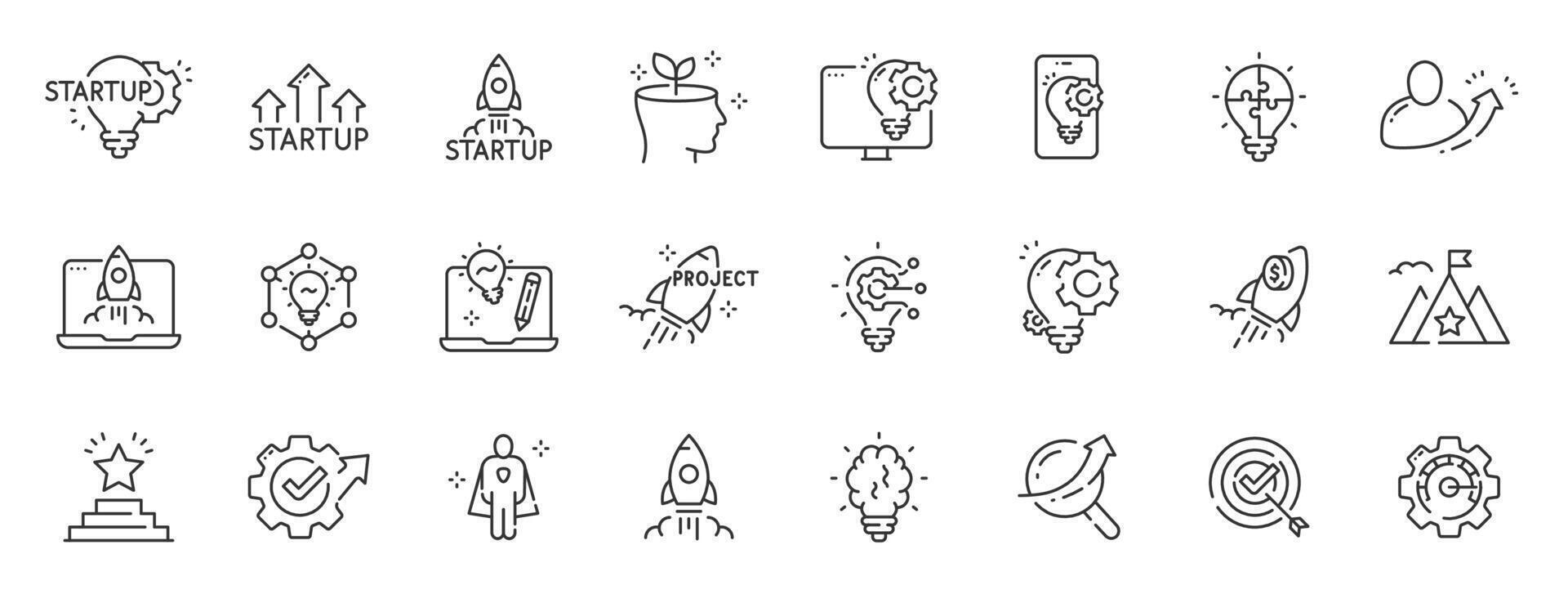 Set of startup related line icons. Launch, rocket, project, development etc. Editable stroke. Pro Vector