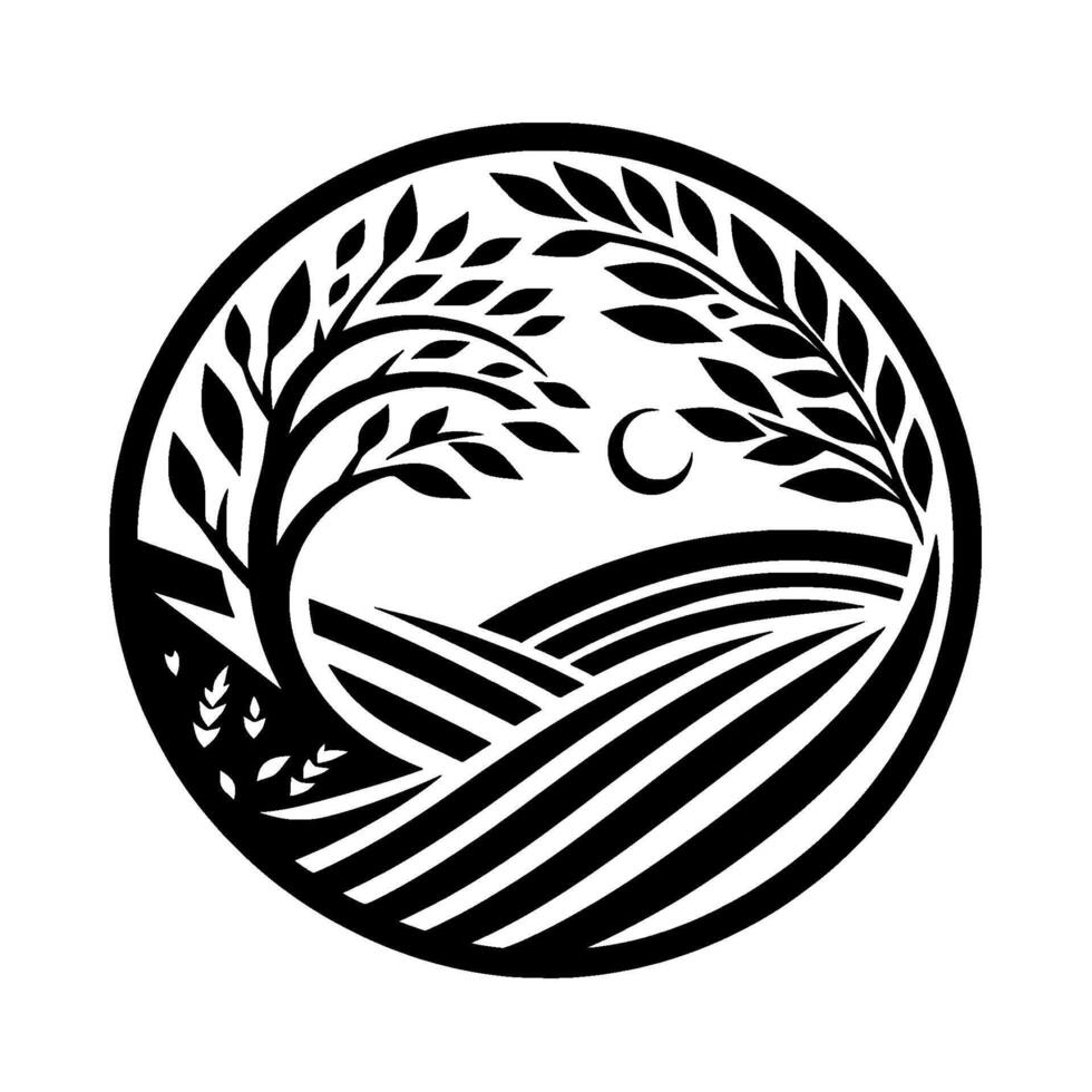 Black and white circular depicting a rural scene with a tree, crescent moon, rolling hills, and fields. vector
