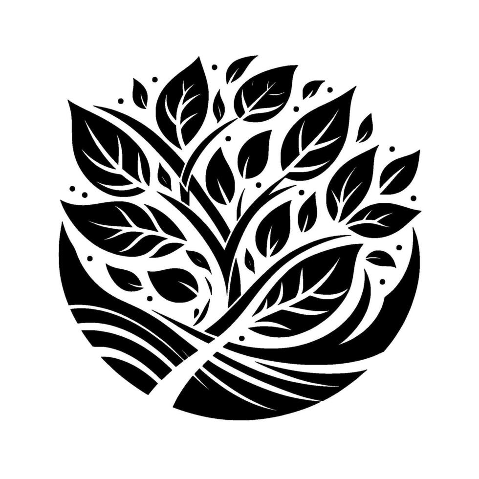 A symmetrical black and white illustration of a stylized tree with stylized leaves and branches within a circular frame. vector