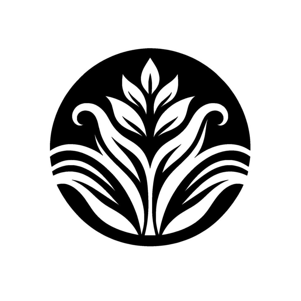 Stylized monochromatic logo Botanical with abstract leaves and curved lines inside a black circle, creating a modern, elegant visual. vector