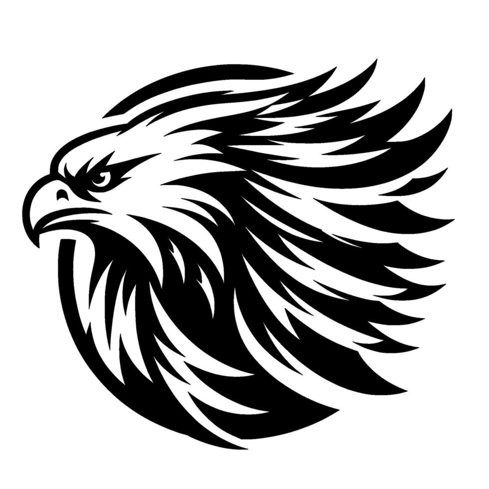 Powerful stylized black and white eagle head with sharp features and flowing feathers, set against a stark white background. vector