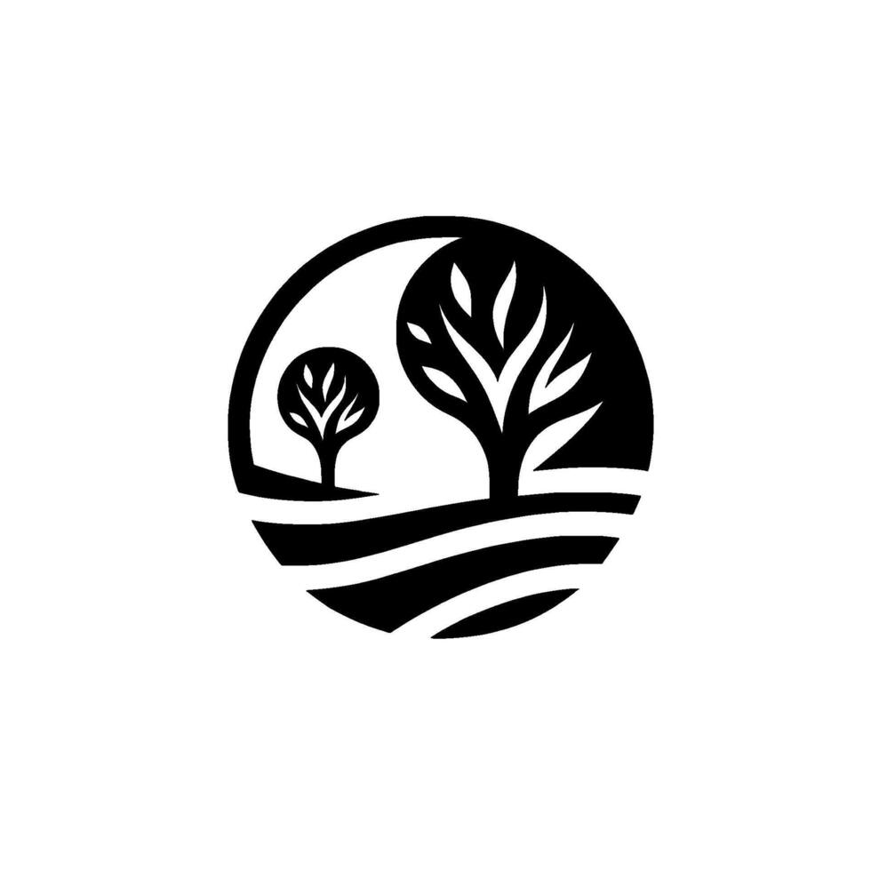 Minimalist black and white featuring two stylized trees within a circular frame, set on a landscape of horizontal lines. vector