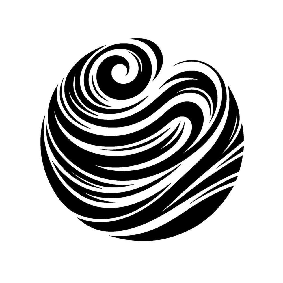 A stylized black and white depicting a spherical form composed of flowing, swirling lines, creating a dynamic and abstract design, with a subtle shadow. vector