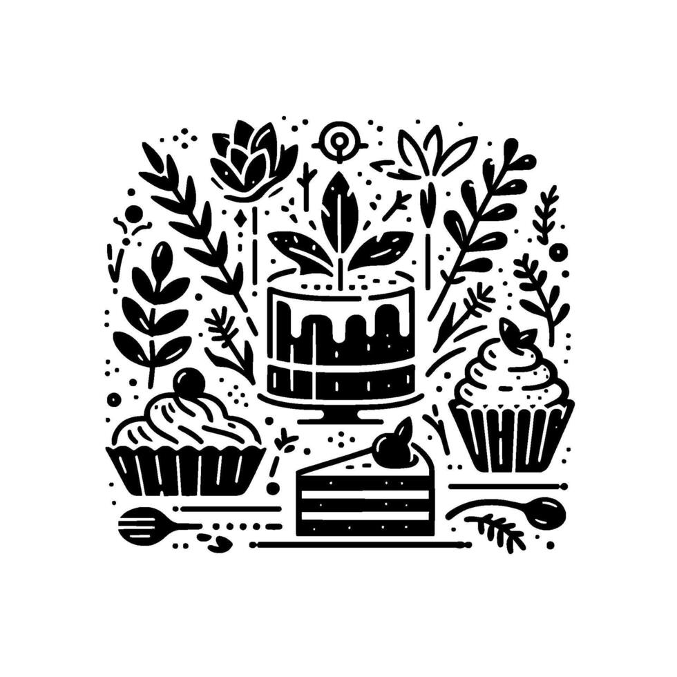 Monochromatic Decorative Dessert Composition Cakes, Cupcakes, and Botanical Elements, Arranged in Square Format vector