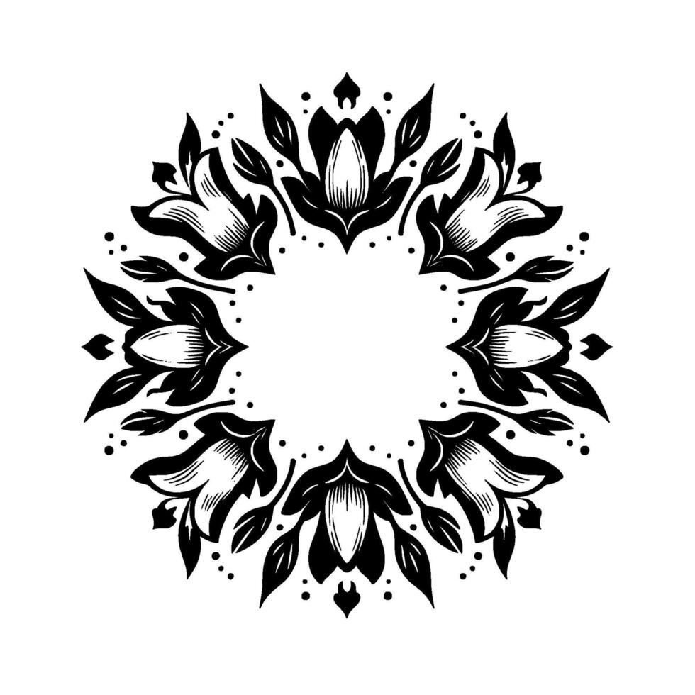 Elegant black and white floral mandala featuring stylized flower and leaf patterns arranged in a symmetrical circular composition with an open center. vector