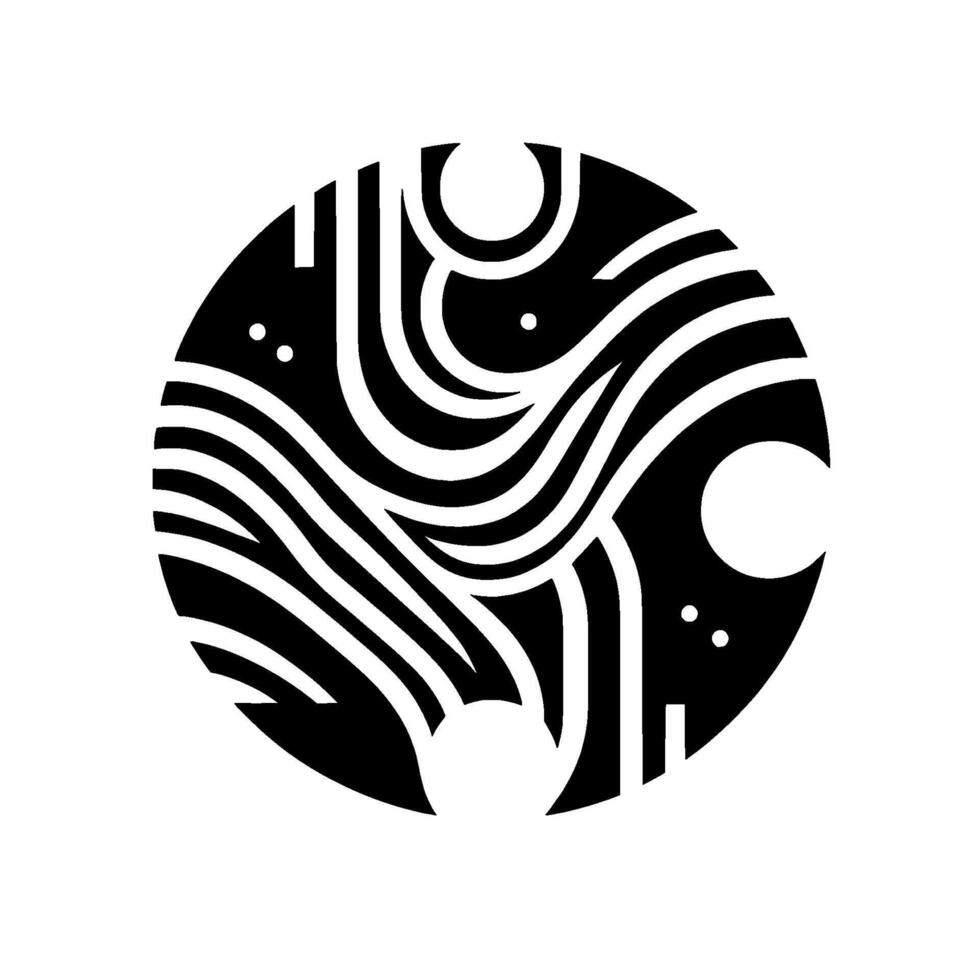 Abstract black and white circular composed of curved lines, geometric shapes, and dots, evoking a sense of minimalism and fluidity on a white background. vector