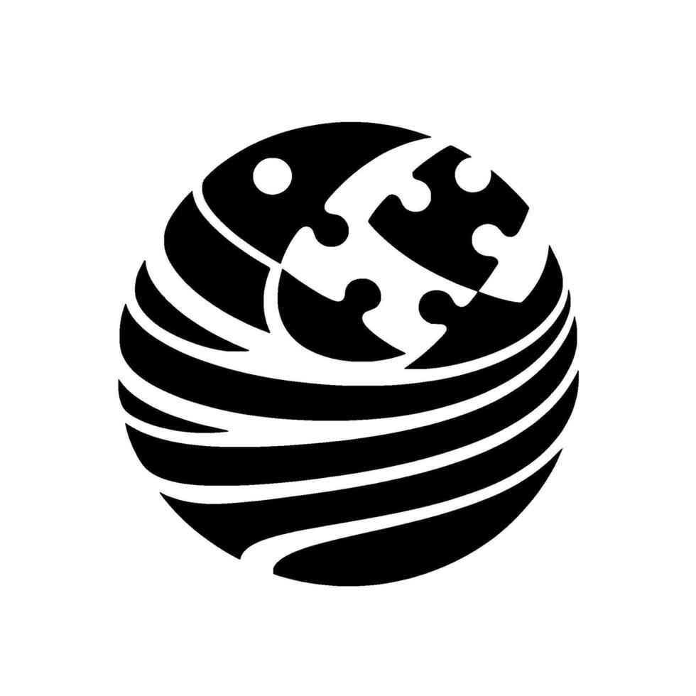 Abstract monochrome featuring a stylized fish silhouette combined with puzzle pieces, nested in a spherical frame with striped textures. vector