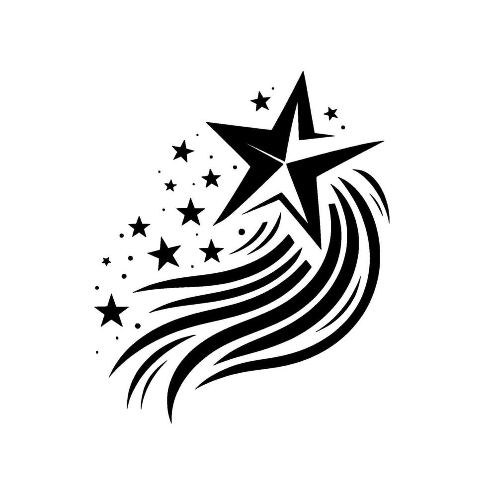 A stylized black and white illustration of a shooting star with multiple star elements and dynamic curved lines against a white background. vector