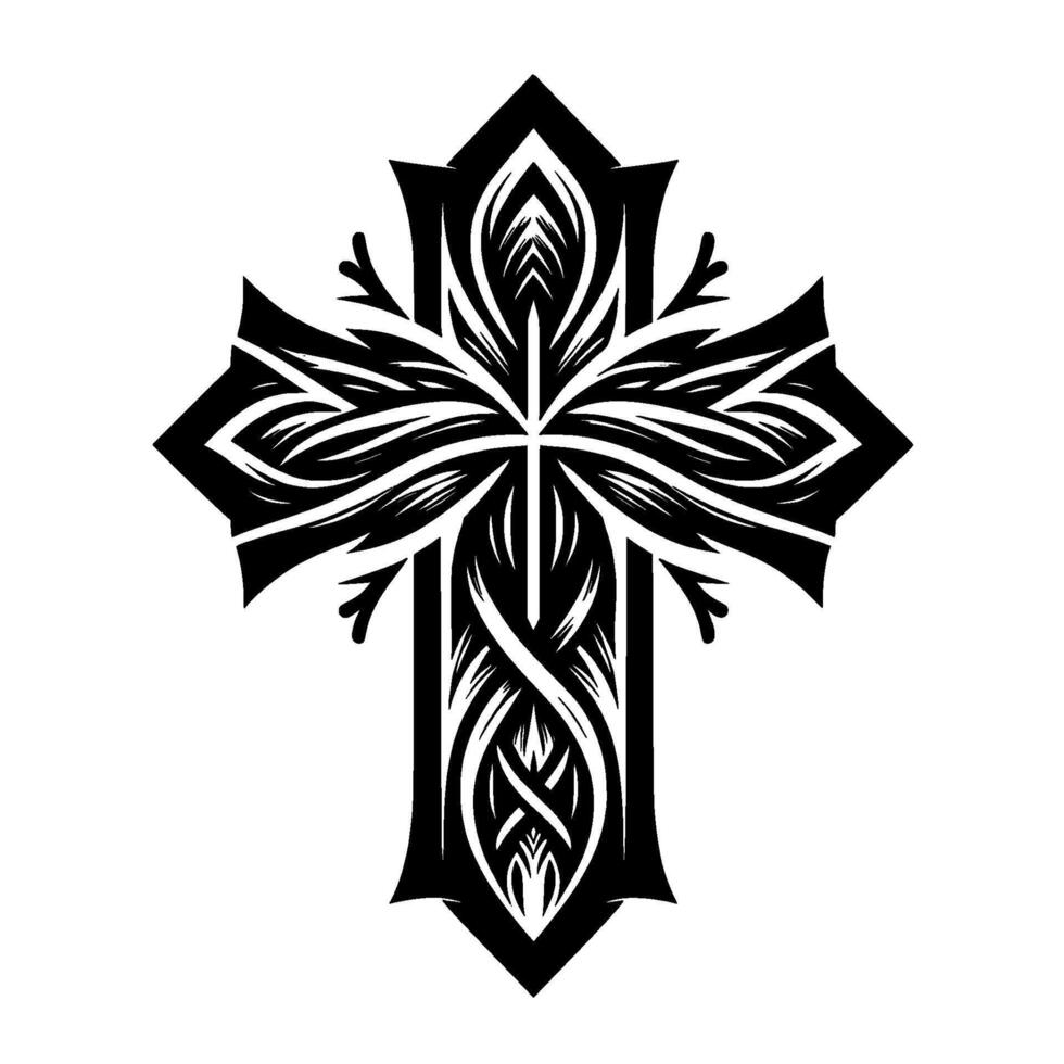 Intricate Black and White Ornamental Cross with Floral and Geometric Patterns on White Background, Artistic Rendering. vector