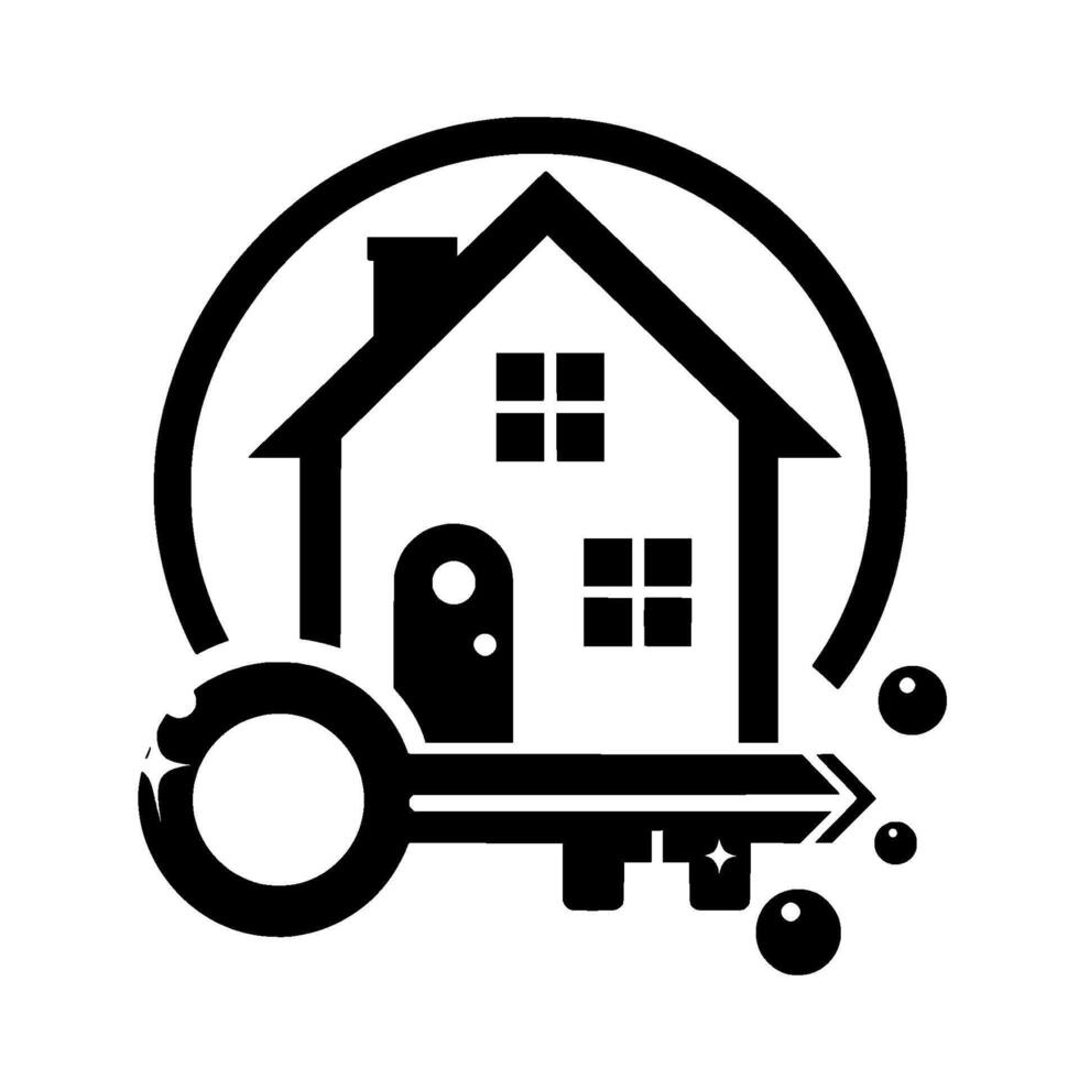 Clean, monochrome real estate featuring a stylized house with a key, enclosed in a circular frame, with abstract accents. vector