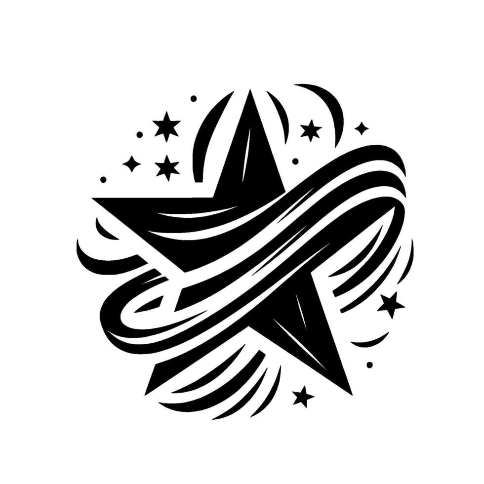 Black and white star with flowing lines, surrounded by smaller stars and dots, creating a dynamic, celestial emblem. vector