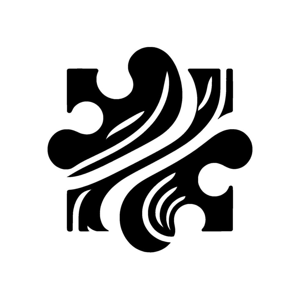 A symmetrical black and white of a jigsaw puzzle piece, adorned with stylized, flowing wave patterns. vector