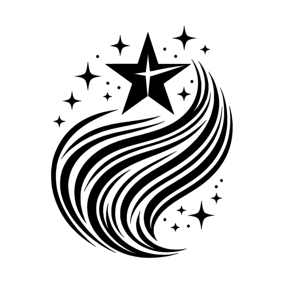 Black and white of a star bursting from stylized, curved, flowing lines with surrounding star elements on a white background. vector