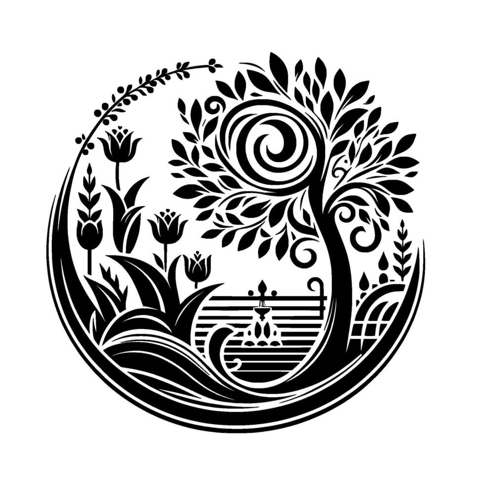 Monochromatic botanical in a circular frame featuring a stylized tree with spiral branches, flowers, water feature, and lush foliage. Pro Vector