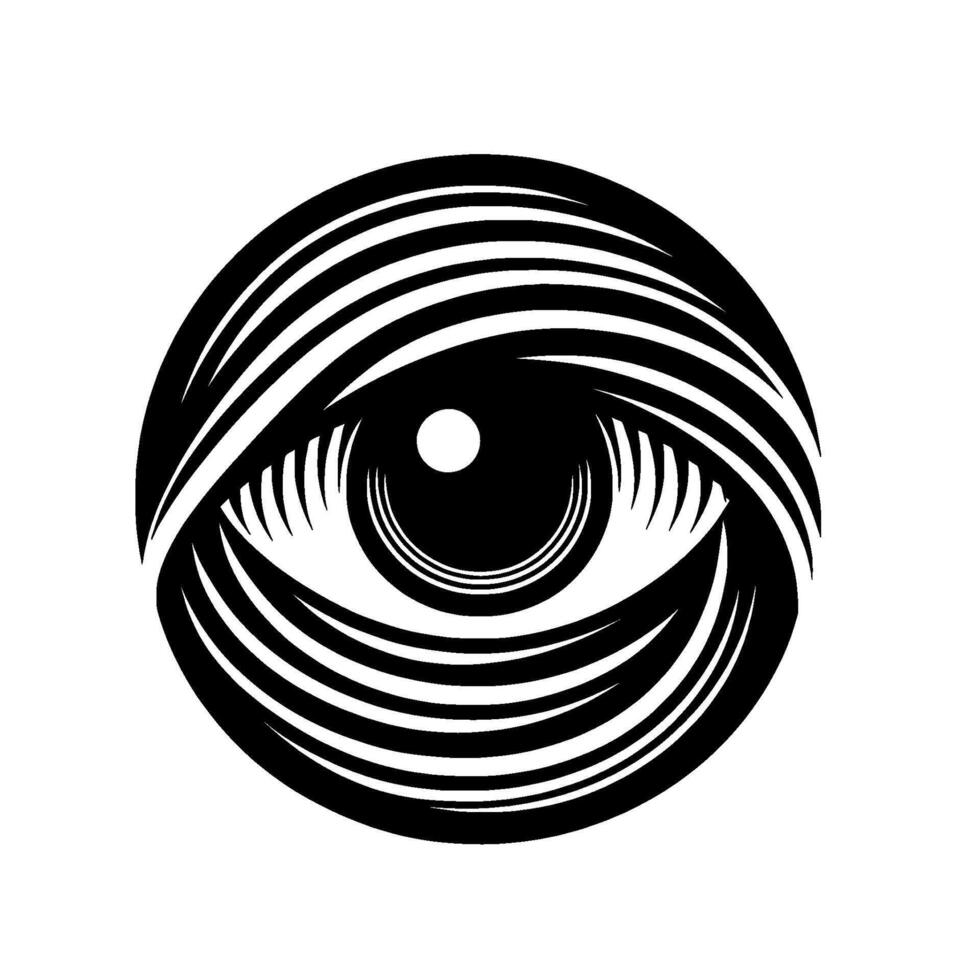 Circular, stylized illustration of an eye with bold, black lines forming concentric shapes, creating depth and a minimalist, geometric against white. vector