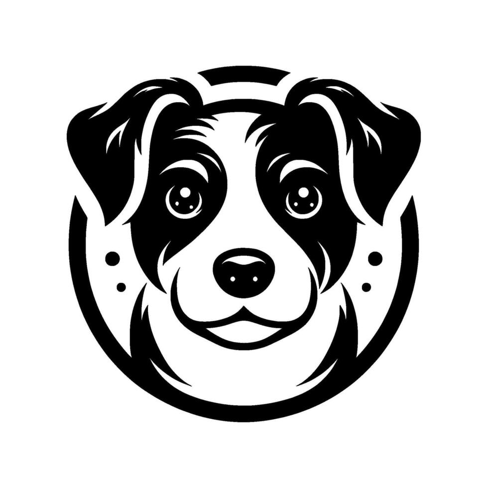 A stylized, black and white portrait of a happy dogs face, within a circular frame, emphasizing its friendly expression. vector