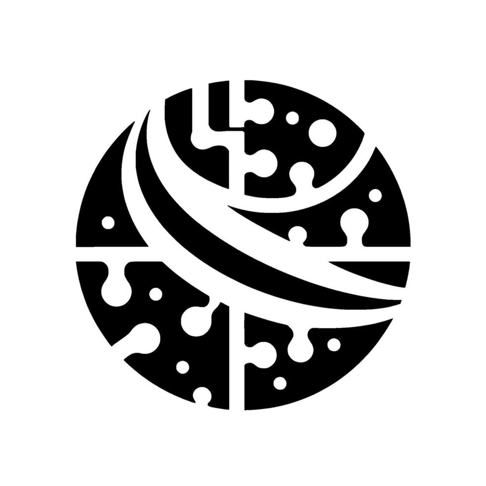 A stylized black and white circular with segmented puzzlelike shapes, dotted texture, and curved, segmented lines. vector