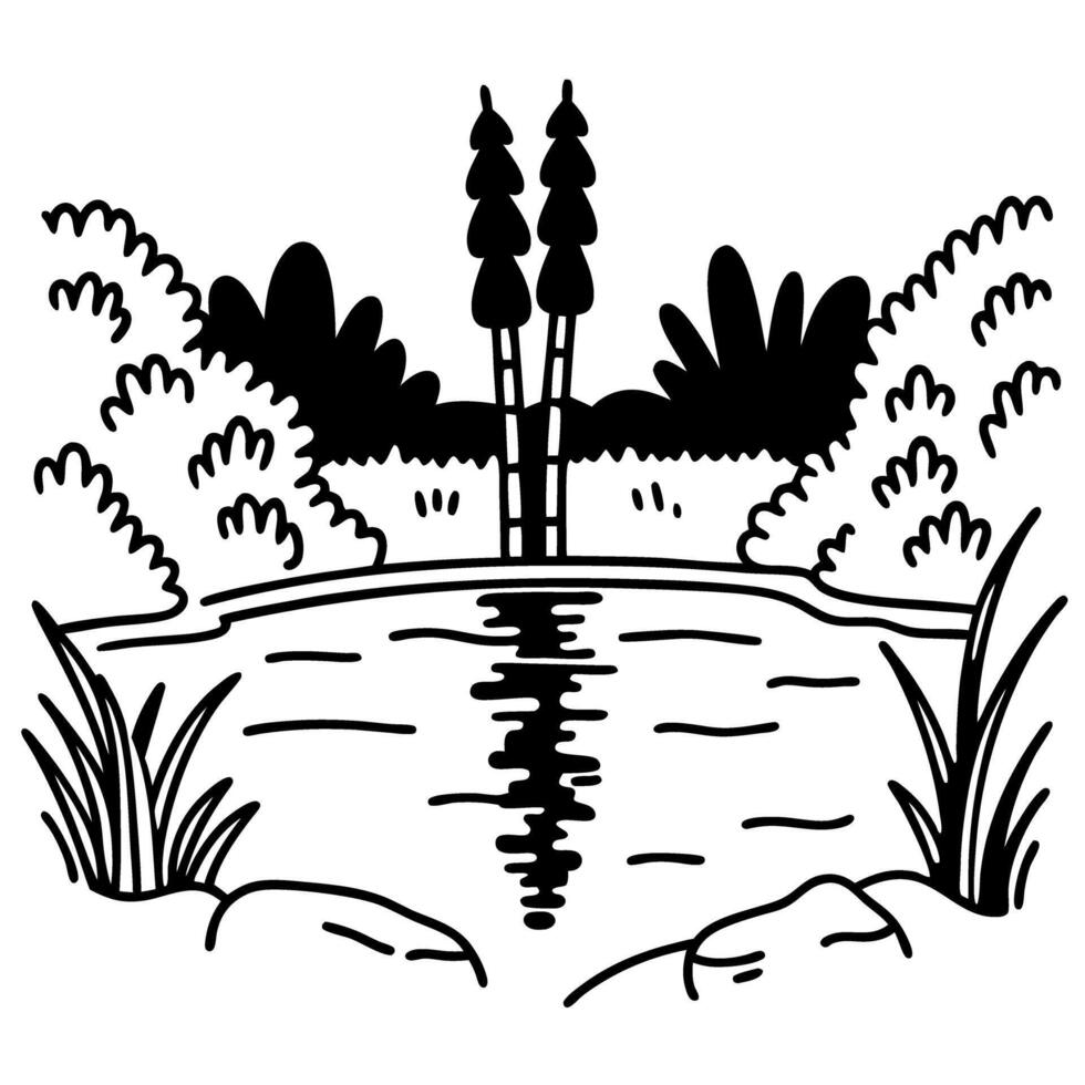 Serene pond with water reflection, trees, and lush bushes in tranquil nature setting Pro Vector