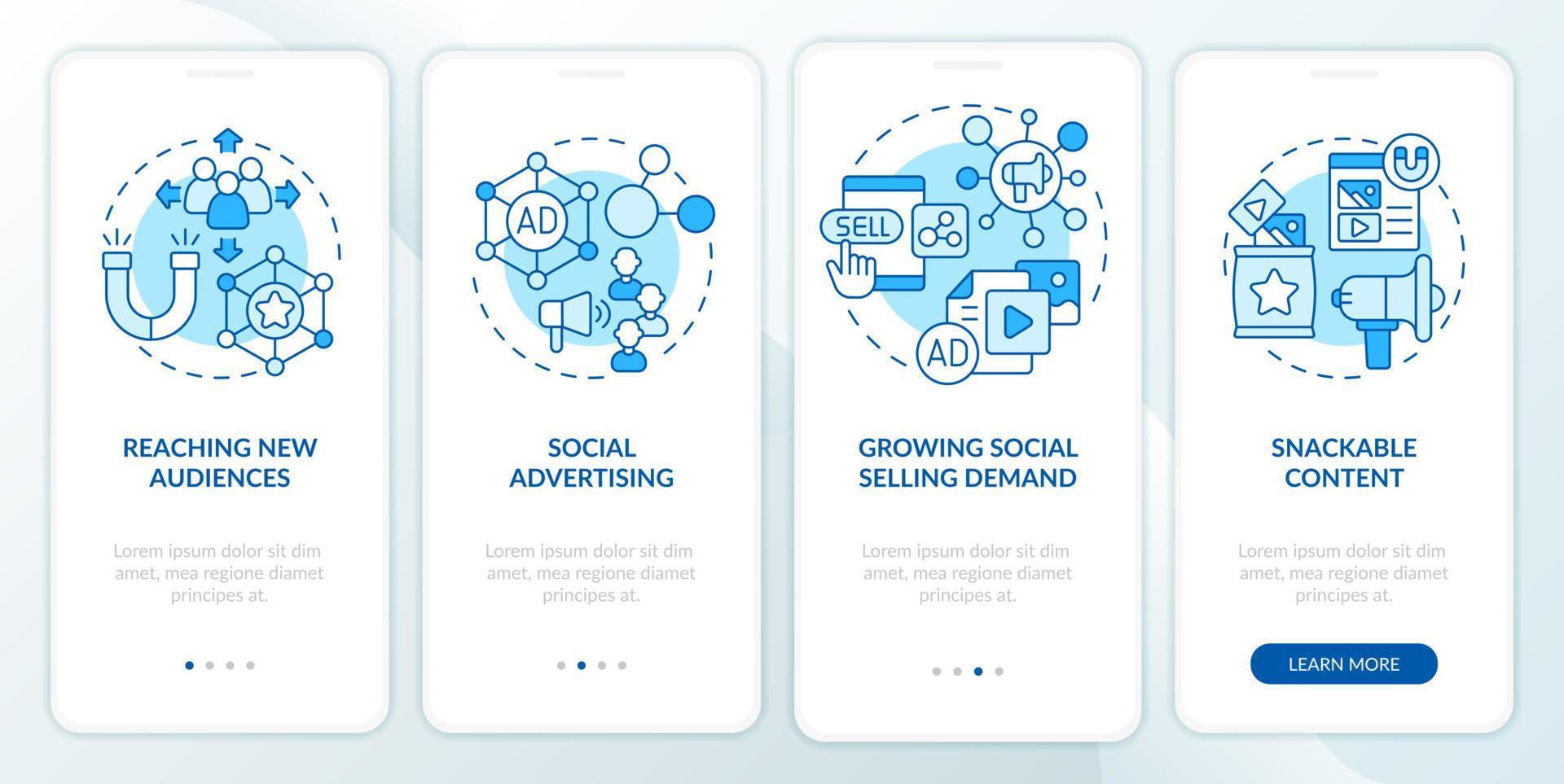 SMM marketing trends blue onboarding mobile app screen. Connection walkthrough 4 steps graphic instructions pages with linear concepts. UI, UX, GUI template. Myriad Pro-Bold, Regular fonts used Pro Vector