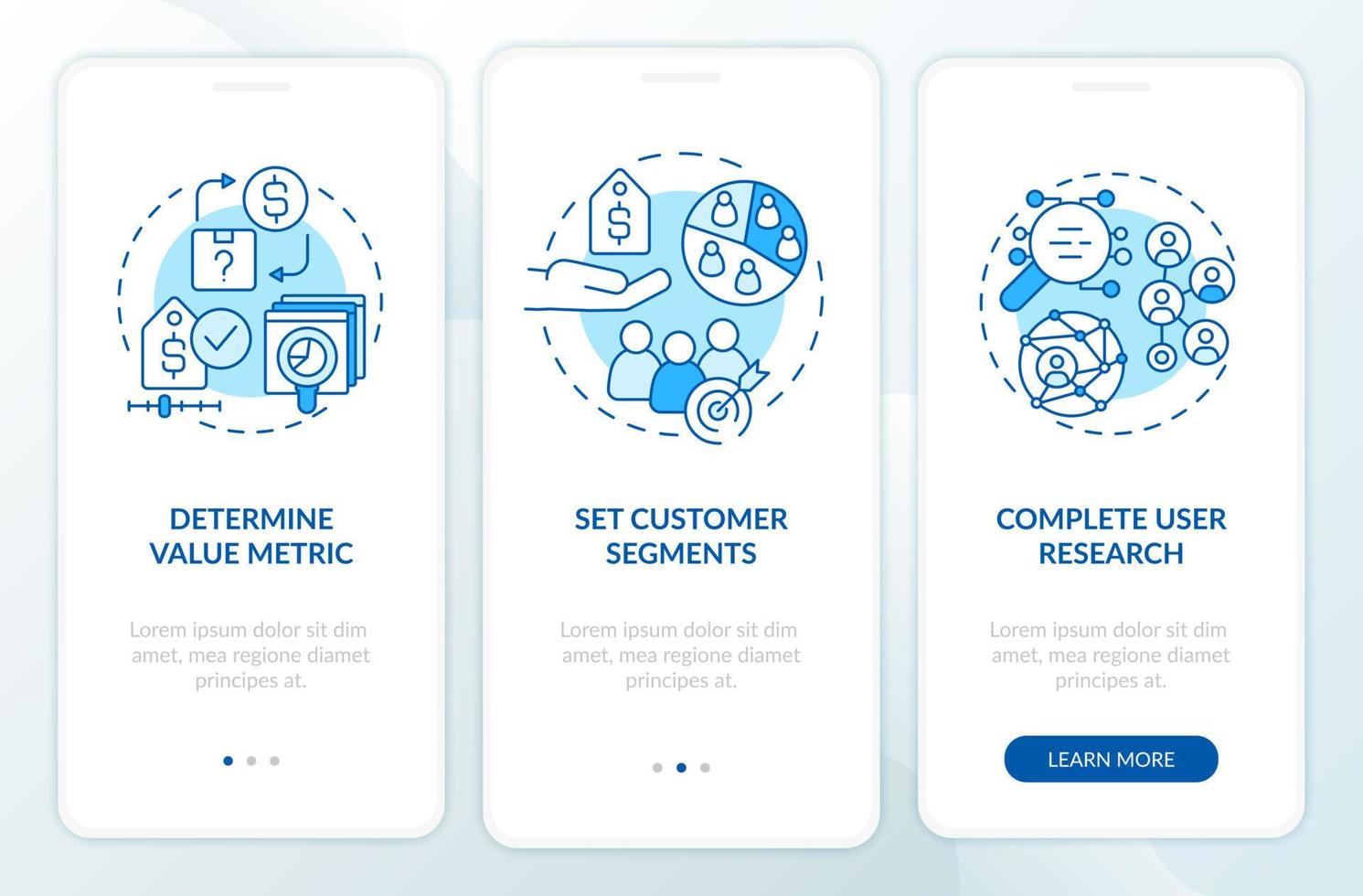 Pricing strategy development blue onboarding mobile app screen. Walkthrough 3 steps graphic instructions pages with linear concepts. UI, UX, GUI template. Myriad Pro-Bold, Regular fonts used Pro Vector