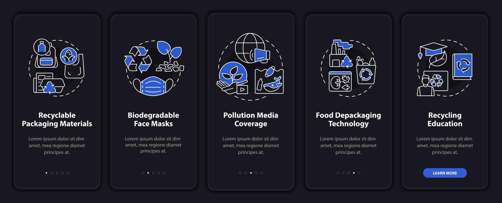 Trash recycling trends onboarding mobile app page screen. Compostable products walkthrough 5 steps graphic instructions with concepts. UI, UX, GUI vector template with linear night mode illustrations Pro Vector