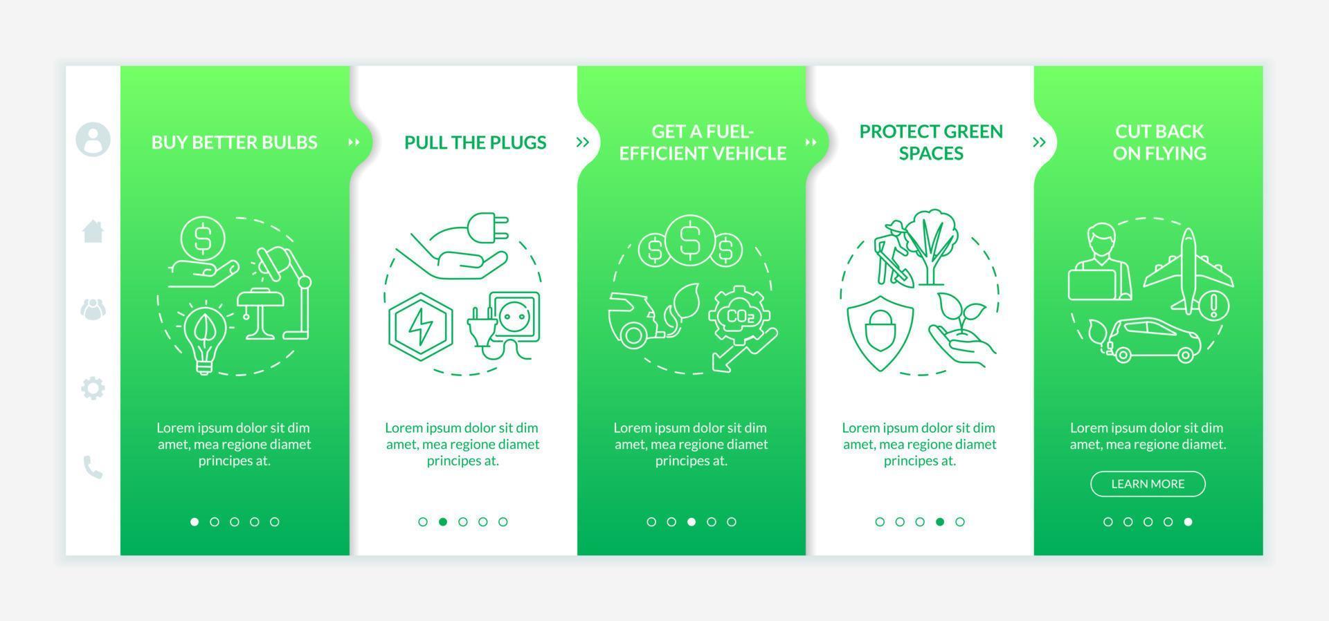 Preventing global warming green gradient onboarding template. Responsive mobile website with linear concept icons. Web page walkthrough 5 step screens. Lato-Bold, Regular fonts used Pro Vector