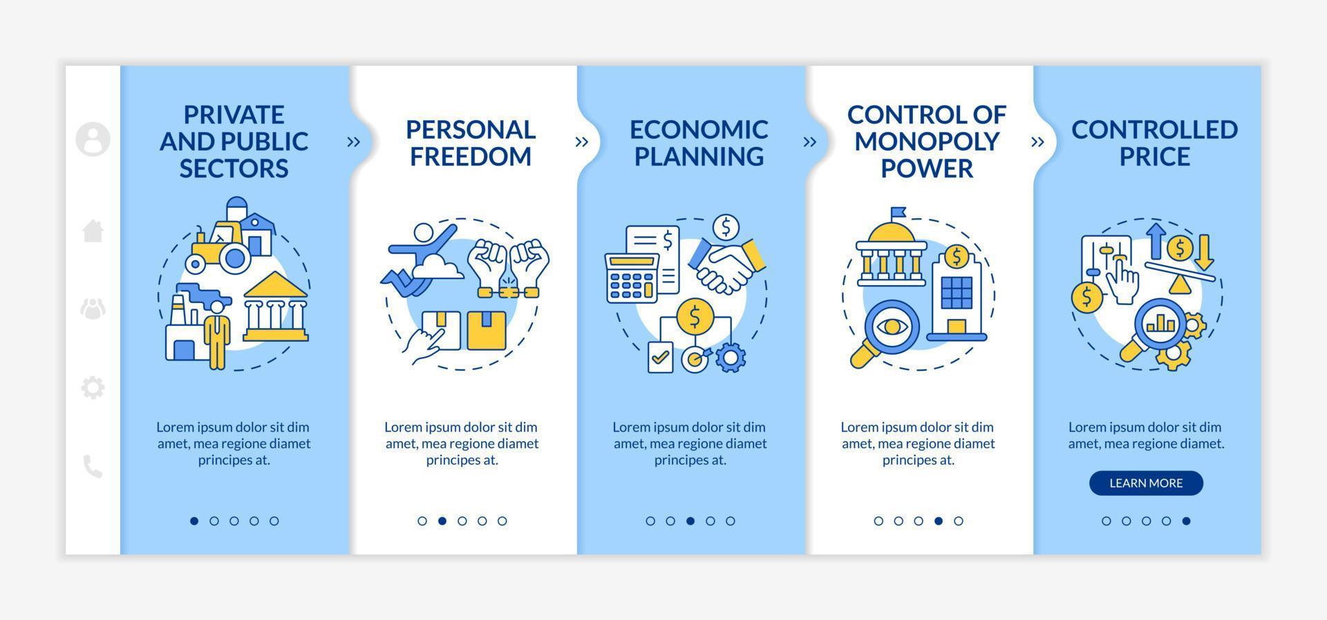 Mixed economy features blue and white onboarding template. State and business. Responsive mobile website with linear concept icons. Web page walkthrough 5 step screens. Lato-Bold, Regular fonts used Pro Vector