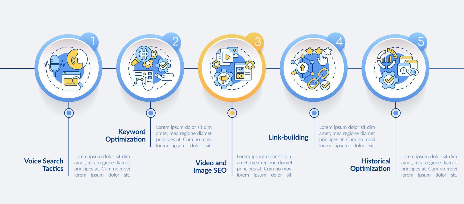 SEO marketing trends circle infographic template. Optimization tools. Data visualization with 5 steps. Process timeline info chart. Workflow layout with line icons. Lato-Bold, Regular fonts used Pro Vector