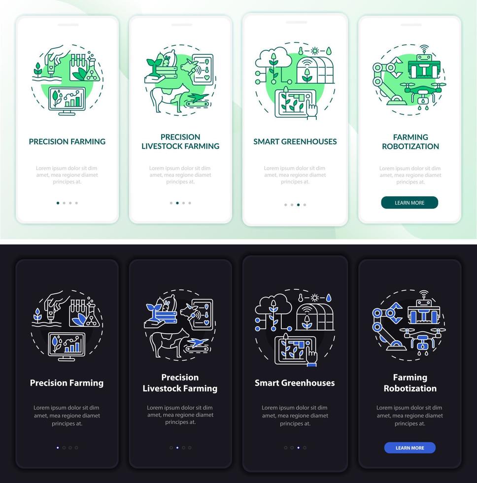 Digital agriculture night and day mode onboarding mobile app screen. Walkthrough 4 steps graphic instructions pages with linear concepts. UI, UX, GUI template. Myriad Pro-Bold, Regular fonts used Pro Vector