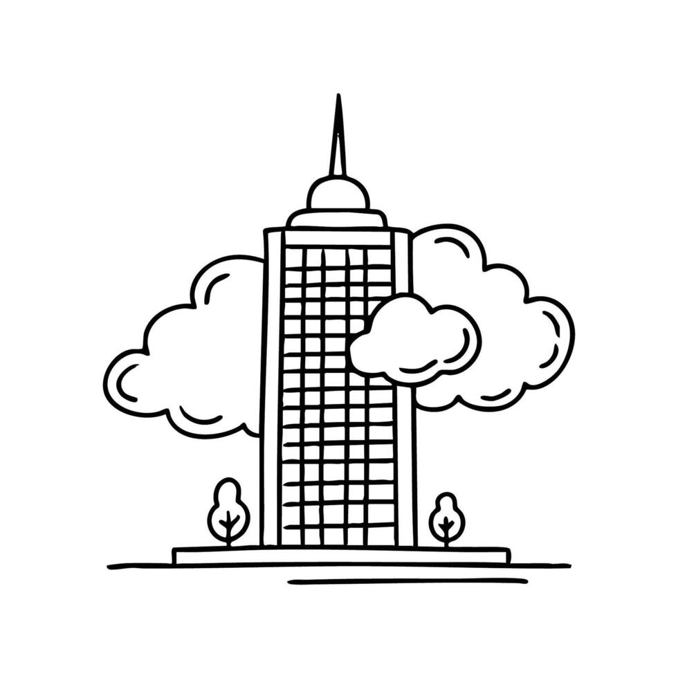 A skyscraper building partially covered by drifting nimbus clouds Pro Vector